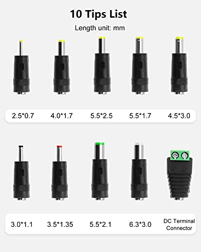 DC 12V 3A Power Cord with an original 5.5×2.5mm tip [DC output port OD is 5.5mm, ID is 2.5mm. The polarity of inside is Positive [+], outside is Negative [-]]. and comes with multiple tips (10pcs frequently used tips): 2.5×0.7mm, 4.0×1.7mm, 5.5×2.5mm, 5.5×1.7mm, 4.5×3.0mm, 3.0×1.1mm, 3.5×1.35mm, 5.5×2.1mm, 6.3×3.0mm, DC Terminal connector. Polarity is internal “+”, outside”-“.