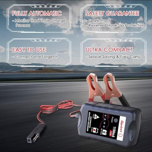 √ Safety Guarantee – Multi protection against Reverse polarity/ Short Circuit/ Over Voltage/ Over Current/ Overload/ Overheat; Spark proof during lead connection; Water and dust resistant float charger, full-loaded and burn-in test proves its stable performance and high reliability.