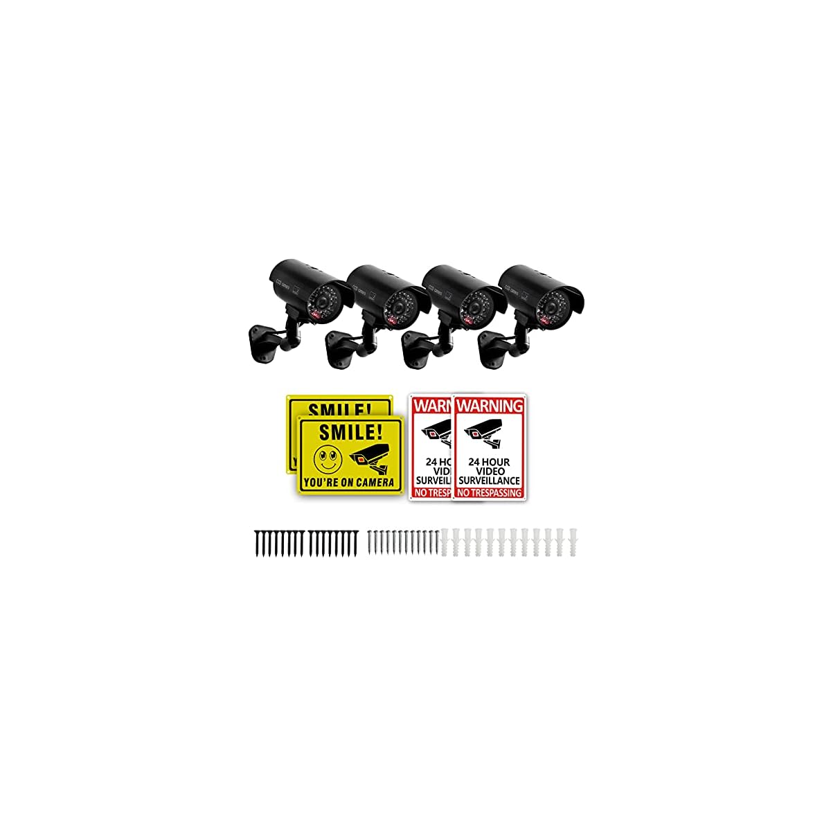 4 Packs Fake Security Camera with No Trespassing Signs Smile You’re On Camera Warning Signs and Screws, Dummy Cameras with Realistic LED Red Flashing Light for Outdoor Yard& Indoor Use Set Of 8