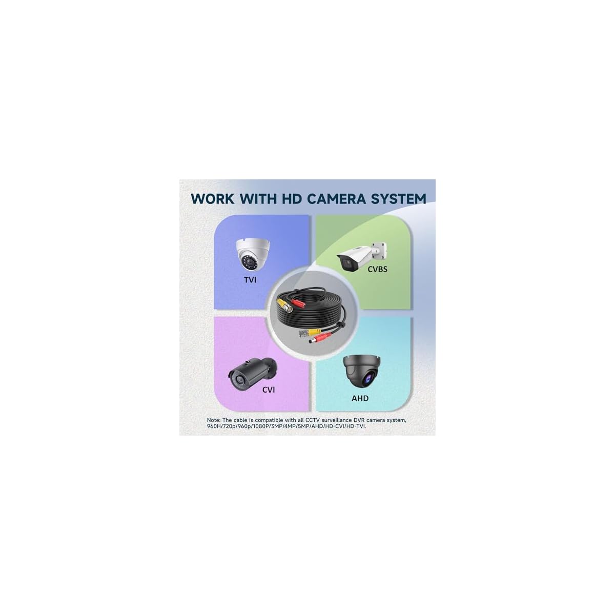 【Smooth 5MP Video Transmission】This cable works for 5MP/4MP/3MP/2MP/1080P/960P/720P/960H, AHD/CVI/TVI/CVBS Security Camera Systems.