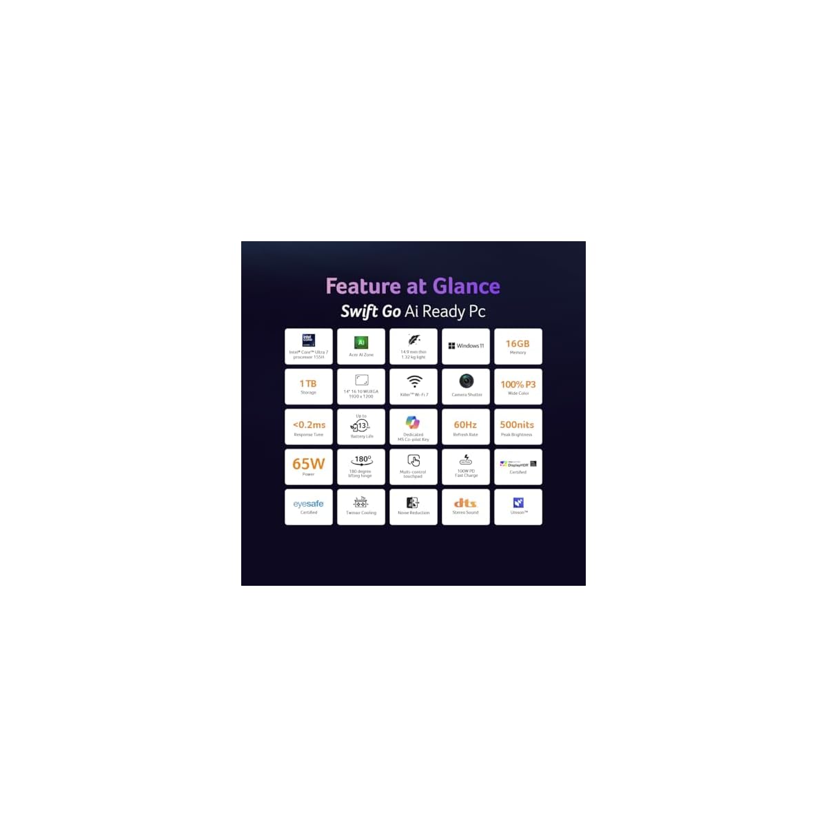 Acer Swift Go 14 Built-in AI PC Premium Laptop Intel Core Ultra 7 155H (14-inch OLED WQXGA+/16GB LPDDR5X/1TB SSD/Intel Arc Graphics/1440p Camera with Shutter/Win11/MSO) SFG14-73, Pure Silver, 1.3 Kg