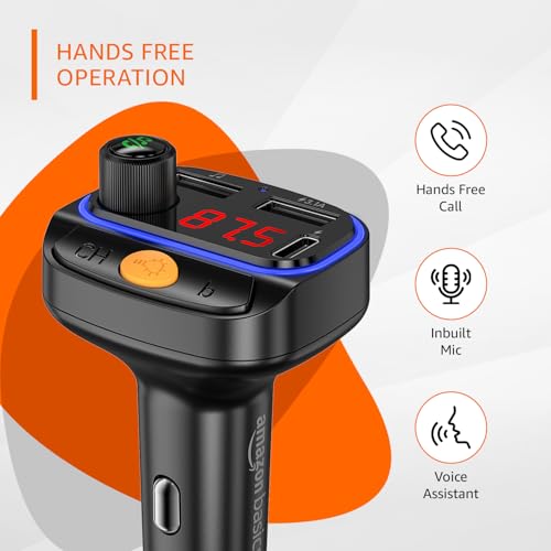 Amazon Basics Car Bluetooth Device with FM Transmitter | 7 Colour LED Lights | 6 Equalizer Presets | Dual USB + Type C Charger | USB MP3 Audio Playback | Voice Assistant