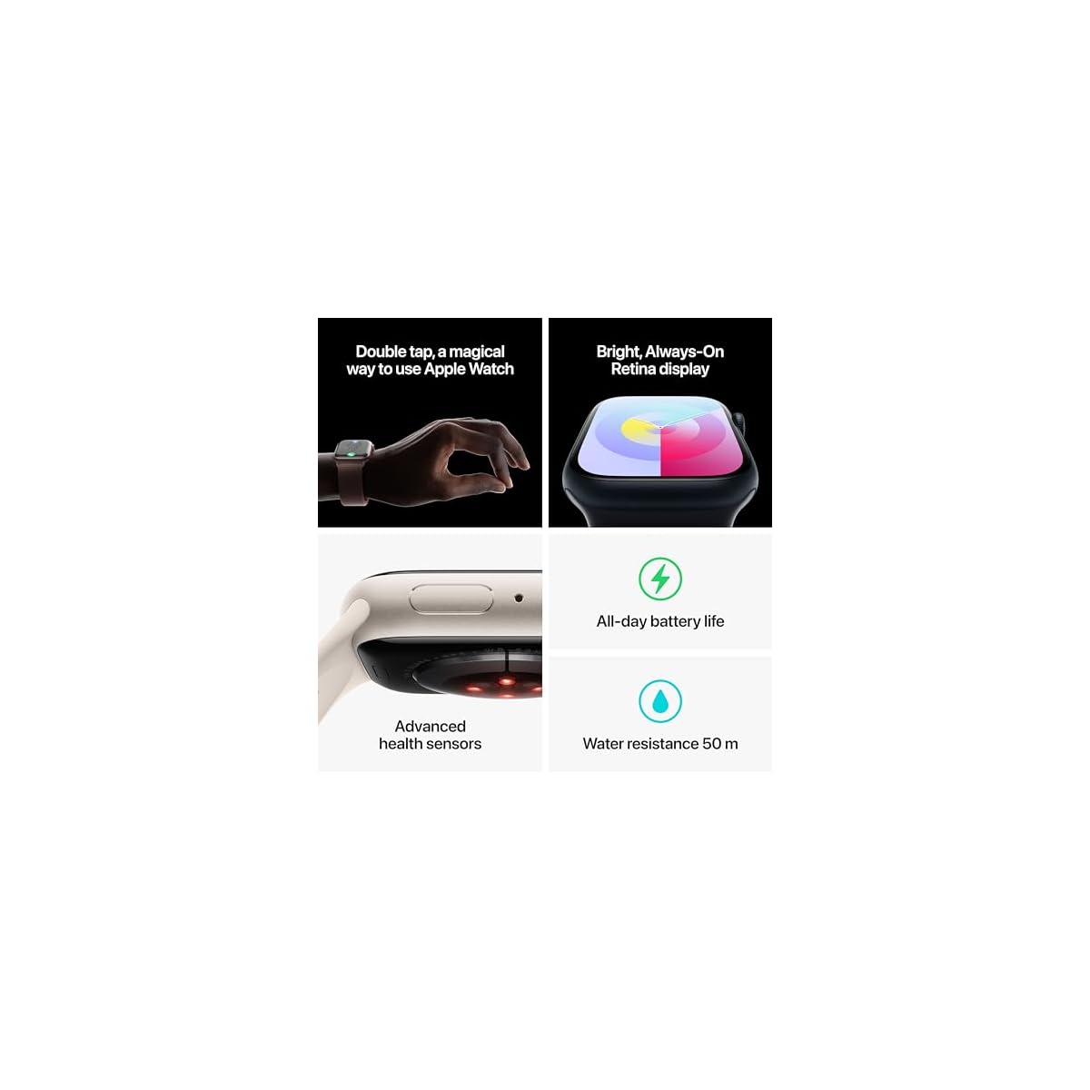 WHY APPLE WATCH SERIES 9 — Your essential companion for a healthy life is now even more powerful. The S9 chip enables a super-bright display and a magical new way to quickly and easily interact with your Apple Watch without touching the screen. Advanced health, safety and activity features provide powerful insights and help when you need it. And redesigned apps in watchOS give you more information at a glance.