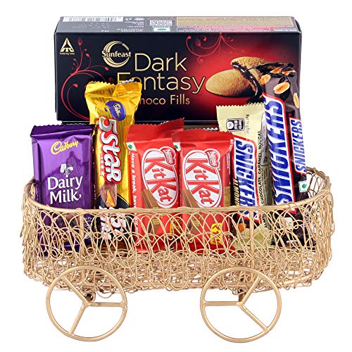 If you are a chocolate lover, there cannot be a better treat for you than this wonderful hamper. Assorted chocolates, such a yummy treat that can easily delight a dear one. This is an absolute bundle of joy. This hamper includes: 1 metal cart, 1 dark fantasy, 1 dairy milk, 1 snicker, 2 KitKat, 1 5Star, 1 snicker almond.