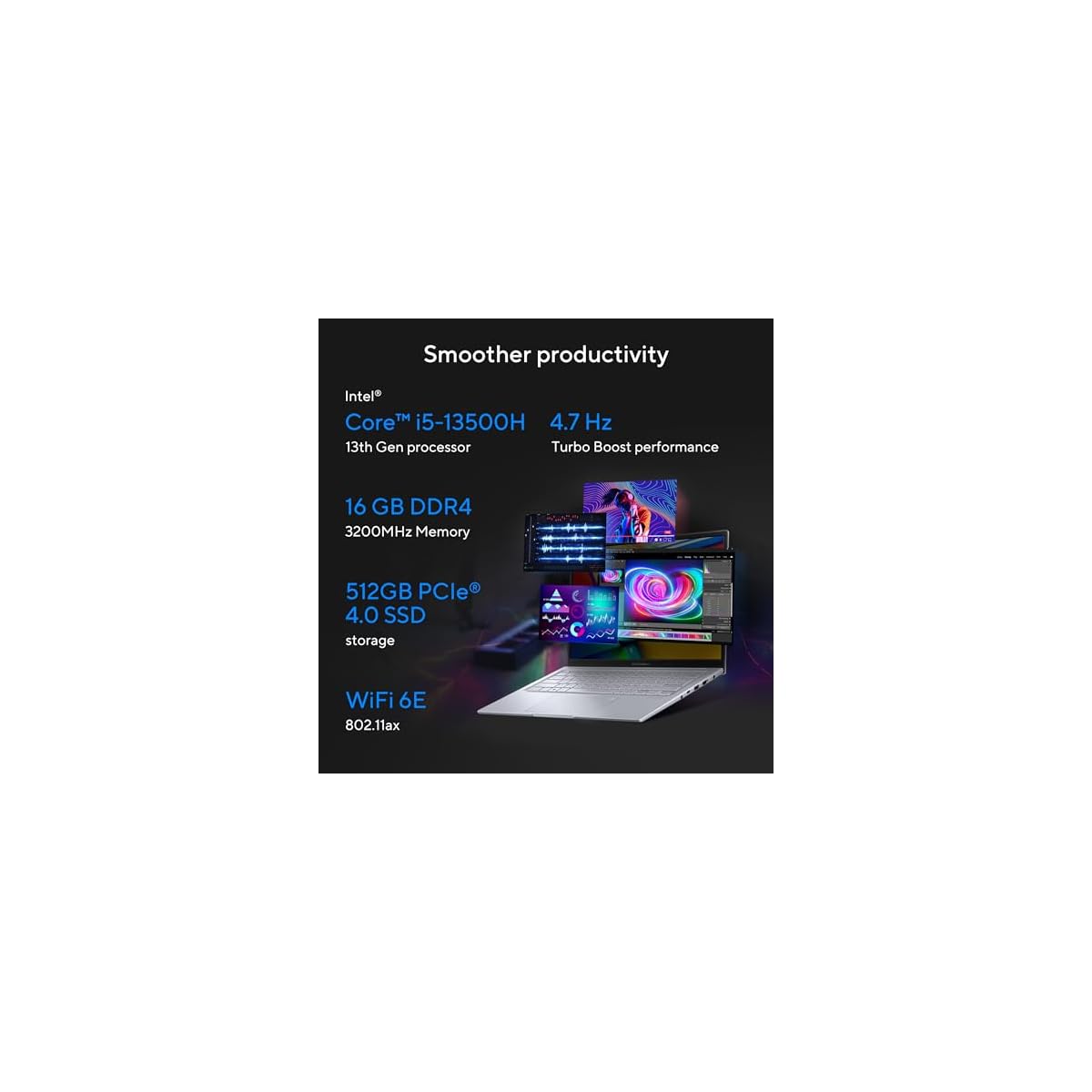 Processor : Intel Core i5-13500H Processor 2.6 GHz (18MB Cache, up to 4.7 GHz, 12 cores, 16 Threads)
