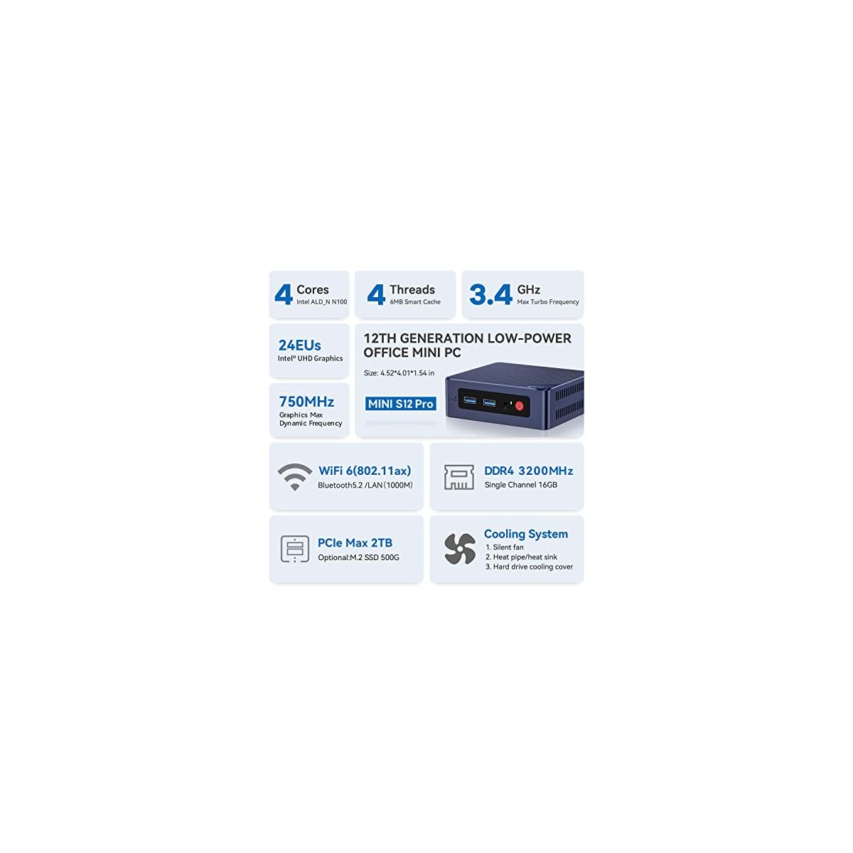 Beelink Mini S12 Pro Mini PC, 12th Intel Alder Lake-N100 (up to 3.4GHz, TDP 6W), 16GB DDR4 RAM 500GB M.2 SSD, Mini Computer Support 4K@60Hz Dual Display/WiFi 6/BT 5.2/USB 3.2/HTPC/Family-NAS