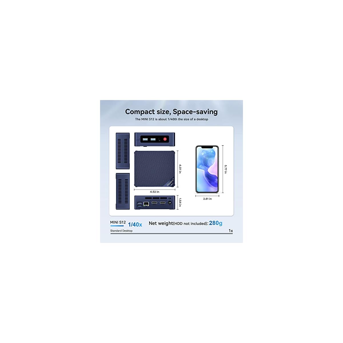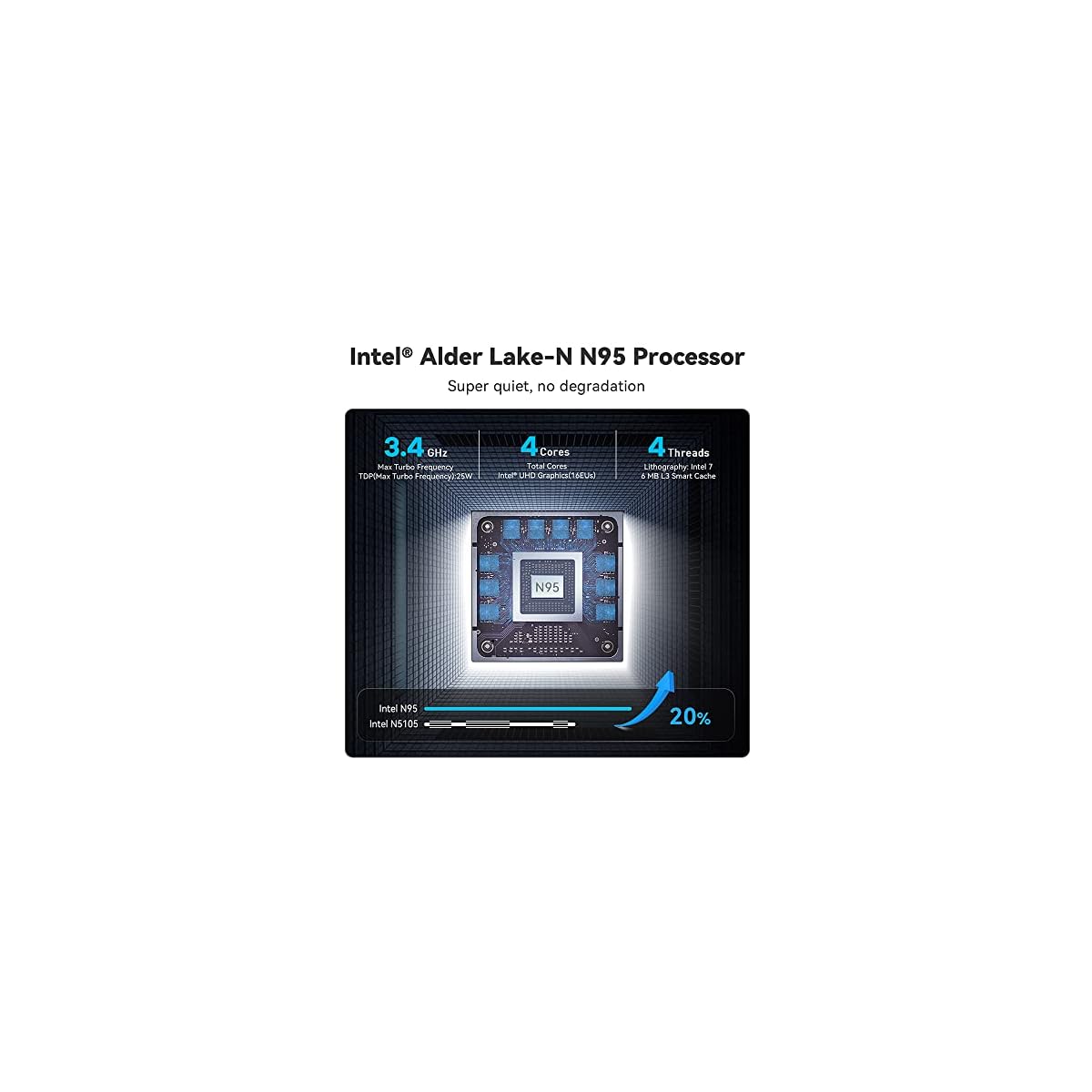 š”Compact size & incredible performancećMINIS 12 Mini PC, the compact size allows you to take it anywhere you go. Equipped with N95 processor (4C/4T, 6M Cache, up to 3.4 GHz), pre-installed with W-11 Pro system. The compact size makes the mini pc a top choice for your light OFFICE work and Home, such as AI, PS, CAD, Office, PR, and video palyback, etc.