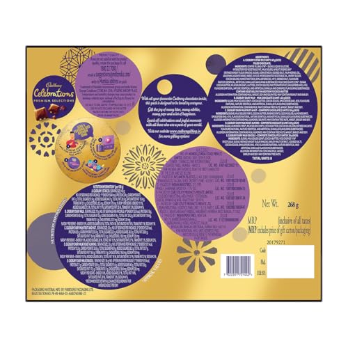 Kuch achha ho jaaye, kuch meetha ho jaaye, with Cadbury Celebrations. Filled with the goodness of Cadbury chocolates, the perfect gift for those whose presence makes every occasion perfect. Made with love, a chocolate box meant for every occasion-a Rakhi gift for your brother or sister, a special one’s Birthday, Diwali with family, create moments to cherish with Cadbury. This assorted chocolates gift pack contains 1 unit of Cadbury 5-Star 3D – 42g, 2 units of Cadbury Dairy Milk Chocolate – 23g, 1 unit of Cadbury Dairy Milk Crackle – 36g, 2 units of Cadbury Dairy Milk Fruit & Nut – 36g and 2 units of Cadbury Dairy Milk Roast Almond – 36g. Perfect for gifting your loved ones on every occasion. Store this in a cool, dry and hygienic place as per back of pack instructions. Just like every bar of Cadbury Dairy Milk, this is suitable for vegetarians.