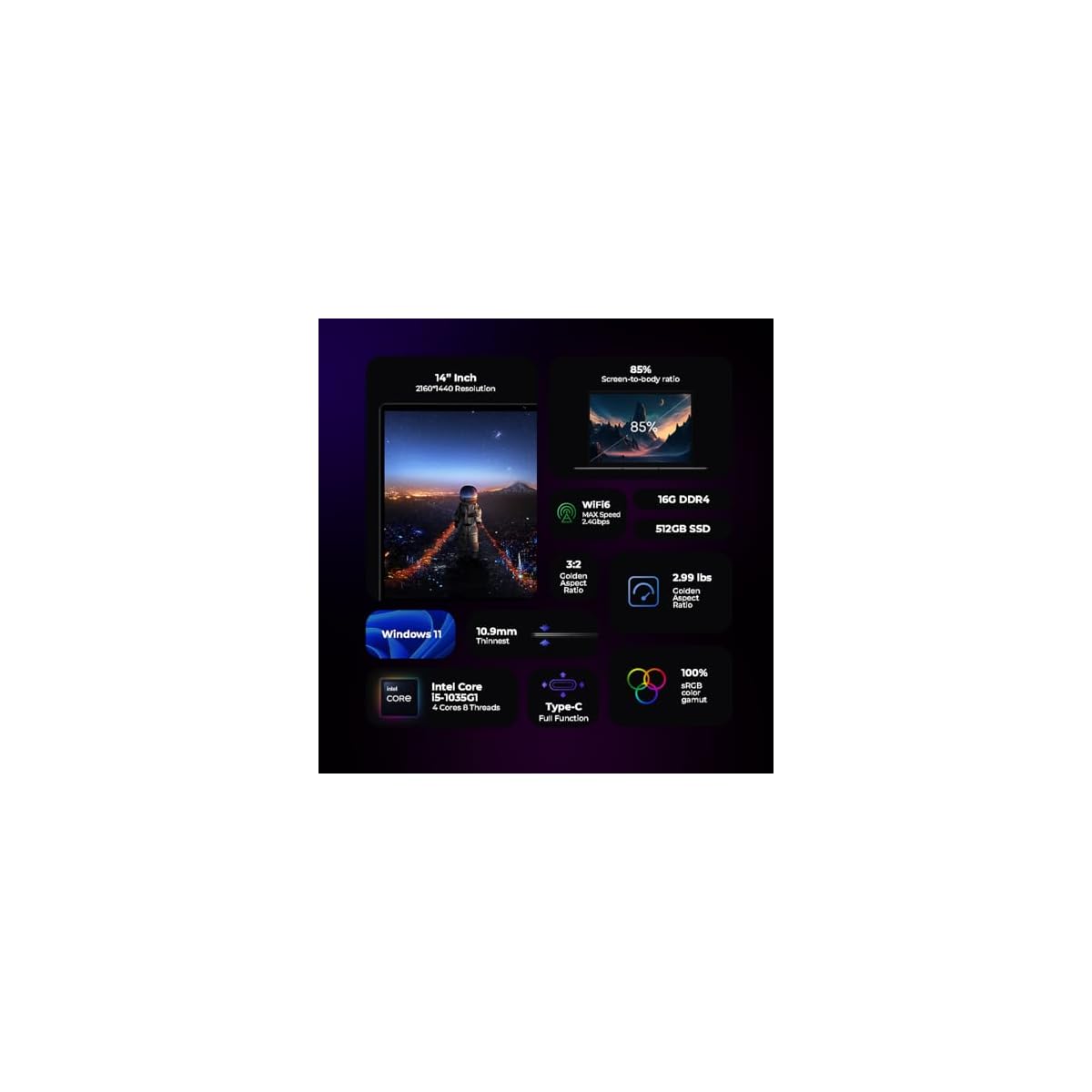 Intel Core i5 Laptop: Chuwi CoreBook X features an Intel Core i5-1035G1 processor with speeds up to 3.6GHz for seamless multitasking and fast processing. Quad-Core Oct Thread, 10nm technology ensures efficient performance.