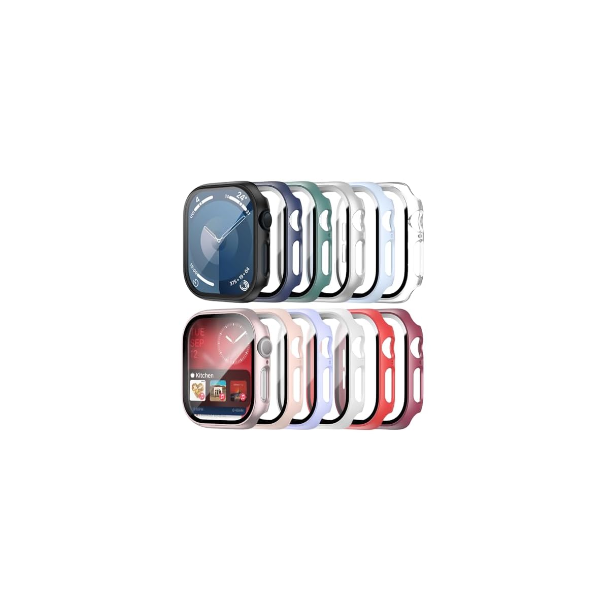 [Package and Service:] 12 color(Black/Silver/Clear/Pink/Rose/White/Red/Blue/Green/Purple/Wine red/Lightblue)12 pack case compatible with apple watch series 9, series 8 and series 7.If there is any dissatisfaction, our customer support will respond within 24 hours.