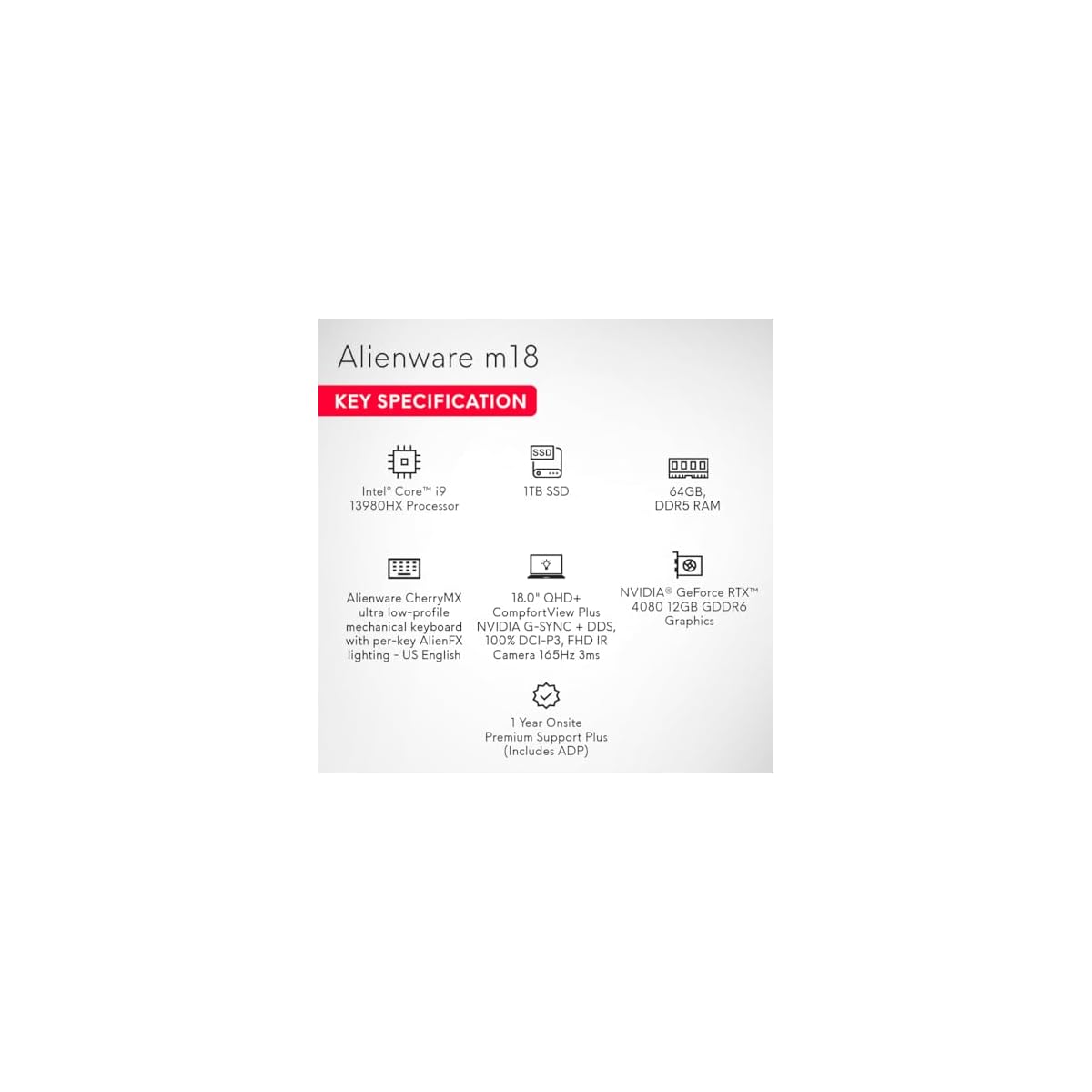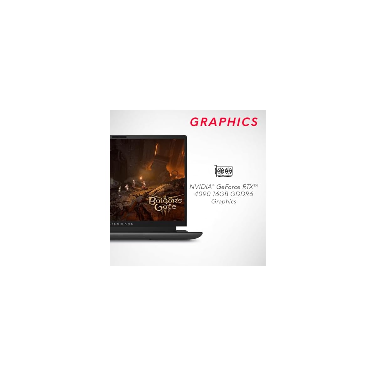 Display: 18.0″ QHD+ CompfortView Plus NVIDIA G-SYNC + DDS, 100% DCI-P3, FHD IR Camera 165Hz 3ms // Graphics: NVIDIA GeForce RTX 4090, 16GB GDDR6 // Keyboard: Alienware CherryMX ultra low-profile mechanical keyboard with per-key AlienFX lighting – US English