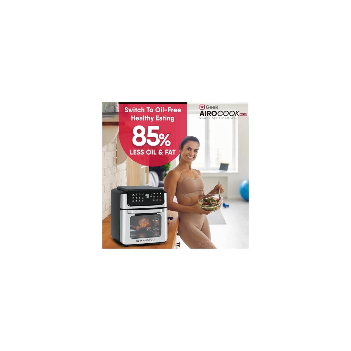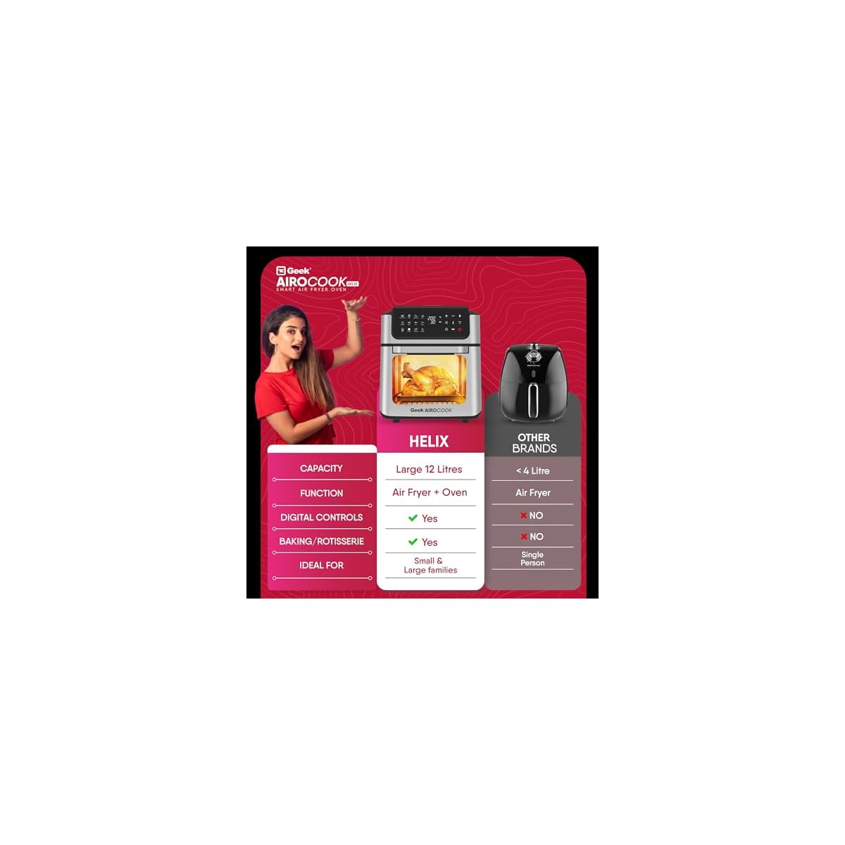 Geek AiroCook Helix 12 Litres Air fryer, 12 Preset Menus, 8-in-1 Digital Touch Oven with Airfry, Bake, Rotisserie, Grill, Toast, Broil, Dehydrate & Keep warm, Recipe Book (1700W) (Grey)