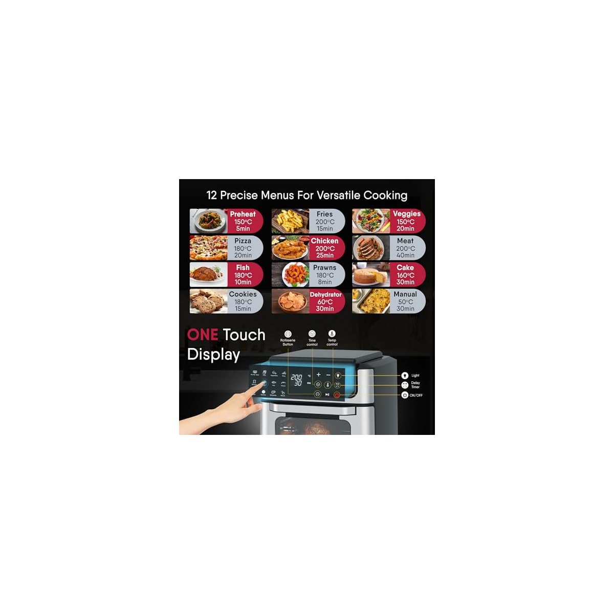 One-touch Operation: The Geek Airocook Helix 12L Airfryer Oven boasts 12 preset menus and a user-friendly LED touch screen, simplifying all your culinary desires into a single touch click. Additionally, you have the flexibility to fine-tune temperature (up to 200°C) and time (up to 60 minutes) to suit your taste.