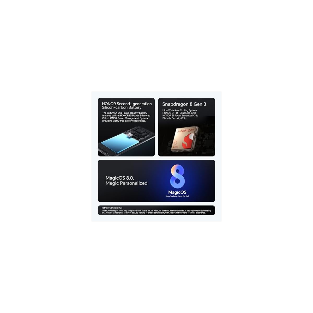 Elite Performance: Qualcomm Snapdragon 8 Gen 3 | 4nm Fabrication Process | GPU Adreno 750 | MagicOS 8.0 based on Android 14 | HONOR Discrete Security Chip S1 for Privacy Protection | HONOR C1+ RF Enhanced Chip for Seamless Connectivity