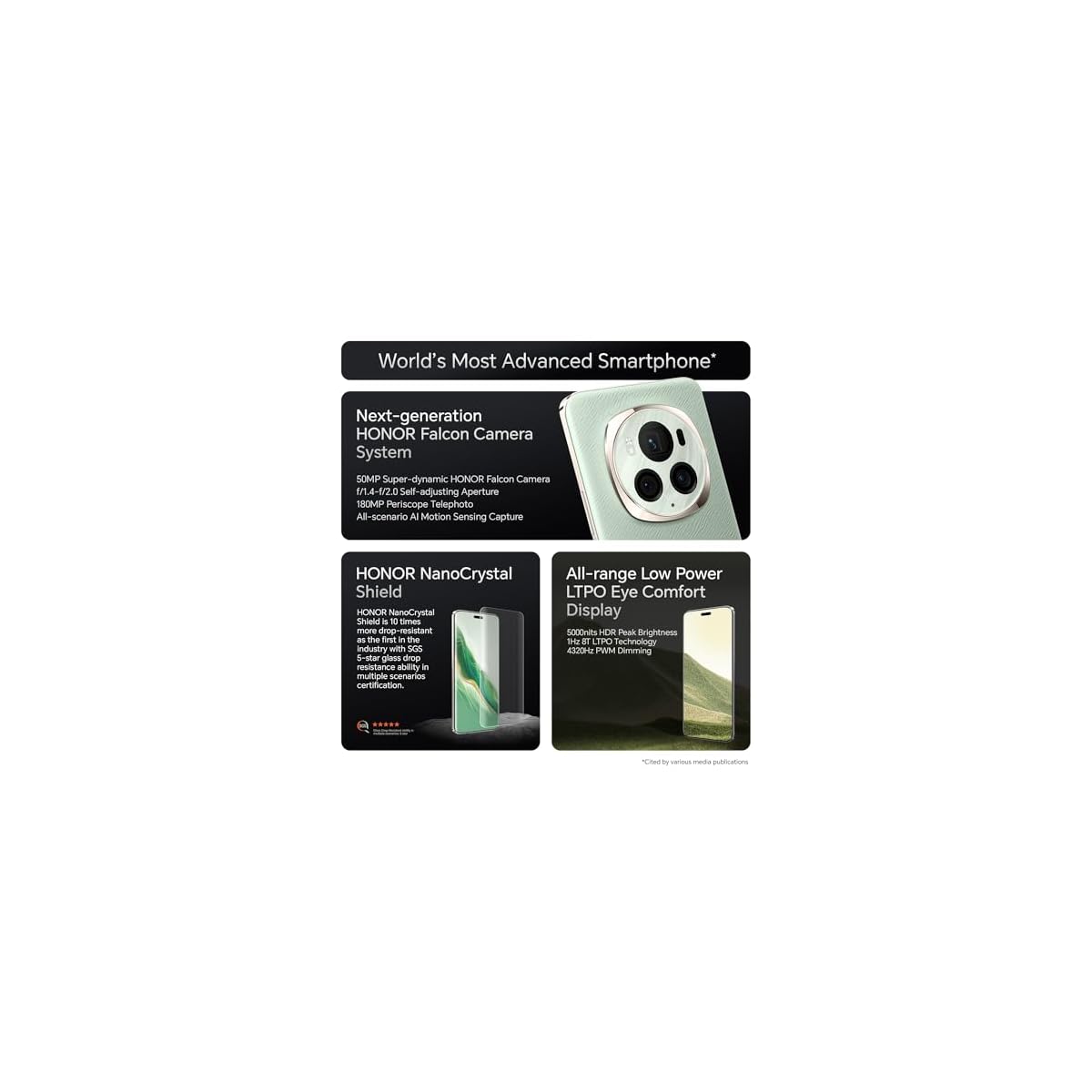 Next Gen HONOR Falcon Camera System: Dual OIS Camera | 180MP OIS Periscope Telephoto, 50MP OIS Main, 50MP Ultra-wide Camera | Selfie Camera – 50MP Ultra-wide with 3D Depth-sensing | 100x Digital Zoom | 2.5x Optical Zoom | 4K HDR Videography with Front & Selfie Camera | AI Motion Sensing Capture | AI Photography