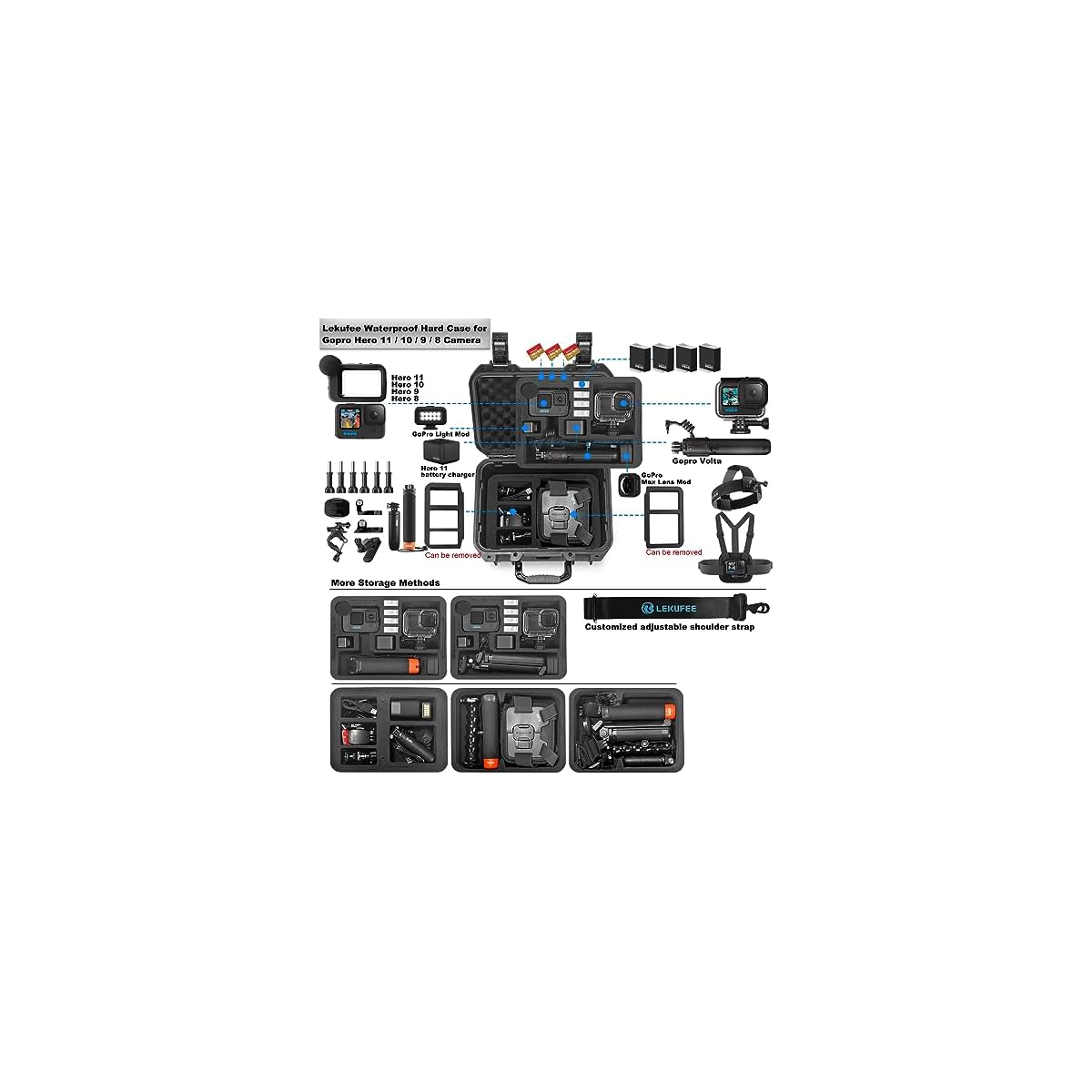 【Storage Capacity】1x GoPro Hero13/12/11/10/9/8 & Gopro Media Mod,4x Battery,1x Gopro Volta (Battery Grip, Tripod, Remote),1x Protective Housing,3x Micro SD Cards,Cable,Light Mod,Max Lens Mod,Handler,Cup,Mount,Hand Strap,Head Strap,Chest Mount,Remote and other Accessories.Custom EVA Foam Compartments Keep your GoPro Hero 11 Action Camera Accessories Organized All through Go back and forth or Transportation.