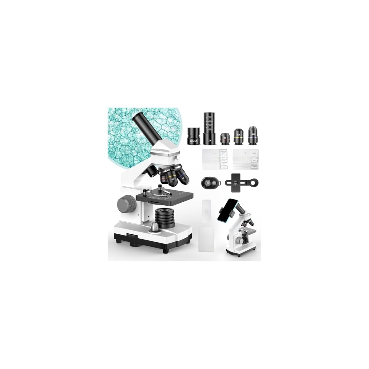 【Complete Accessories】This microscope set includes a phone adapter, Bluetooth shutter, 10 operating accessories, 28 microscope slides, and a carrying bag. It has everything you need for biological observations.Apple Shopping Event