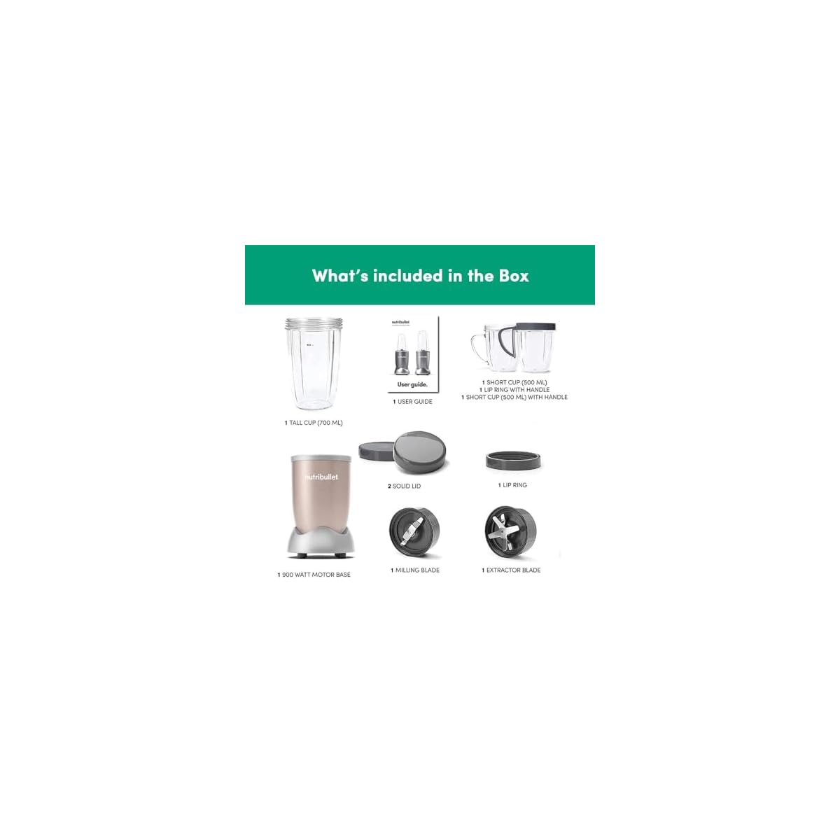 Includes 1-900W Motor Base, 1-709ml of tall cup, 1-532ml short cup with holder, 1-532ml short cup, 1-emulsifying blade, 1-lip ring, 1- flat blade, 2 lids, 1 pocket nutritionist, user book with recipe