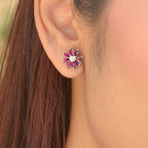 Ornate Jewels 925 Silver Red Ruby American Diamond Flower Stud Earrings for Women and Girls | With Certificate of Authenticity & 925 Stamp | Life-time Warranty*