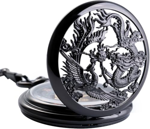 SPECIAL DESIGN – The design of this pocket watch is unique and antique. You can see hollow pattern phoenix and dragon on the case, which stand for peace, perfect and happiness, and symbolizes the BEST of LUCK. Bright black case, Roman numerals, Special skeleton dial with golden movement, make it looks very Elegant, Smart, Vintage and fashionable!