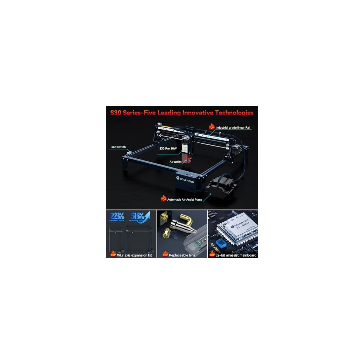 SCULPFUN S30 Pro Max Laser Engraver with Auto-ON/Off Air Assist System, 256-bit Color Scale Laser Engraving Cutting Machine, 20W Laser Module Cutter for 0.05mm Metal