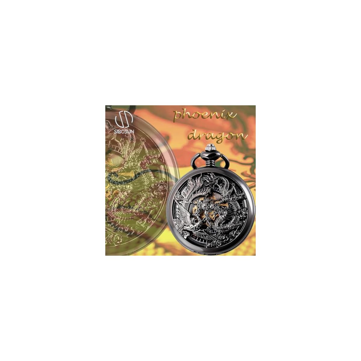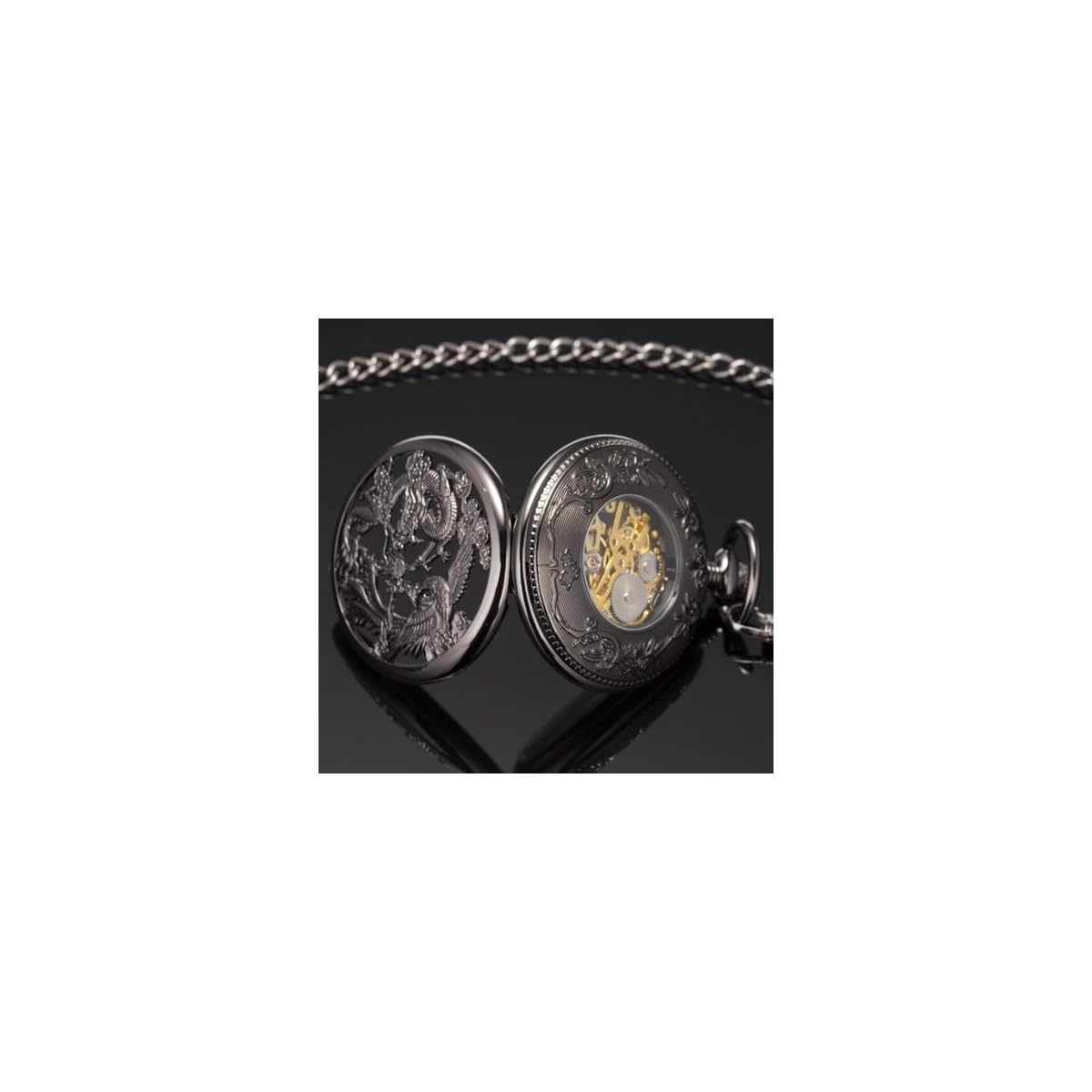 SIBOSUN Antique Phoenix and Dragon Skeleton Pocket Watch Mens Mechanical Black Half Hunter Hand Wind