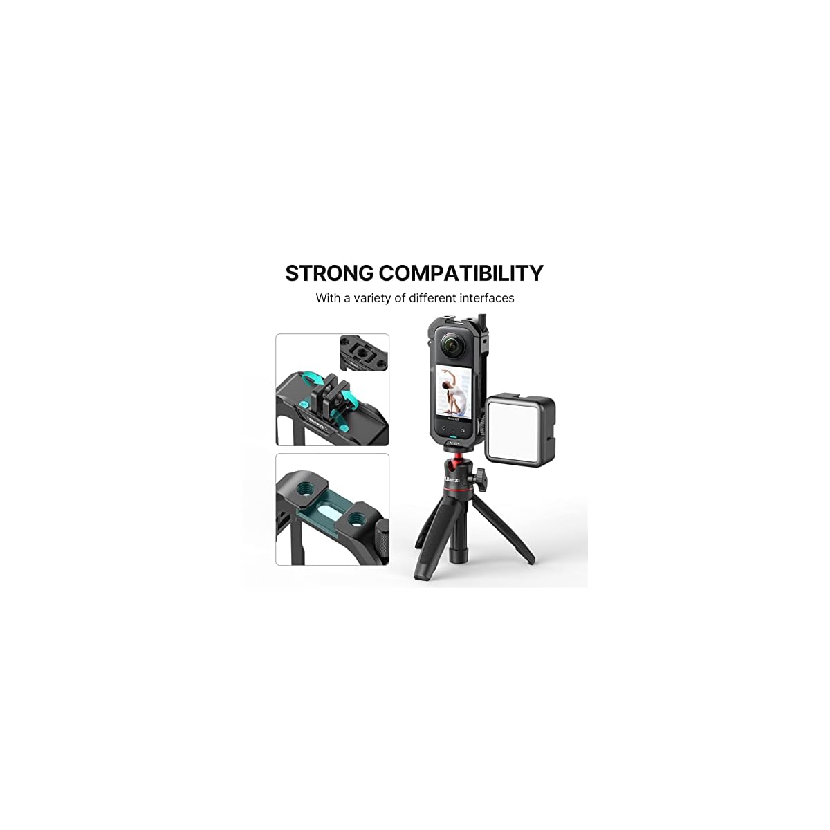 【Rich Expansion】Equipped with 2 cold shoe mount, enable to mount mic and led video light at the same time; multi 1/4″ screw hole available; fits both 1/4″ tripod and action cam tripod