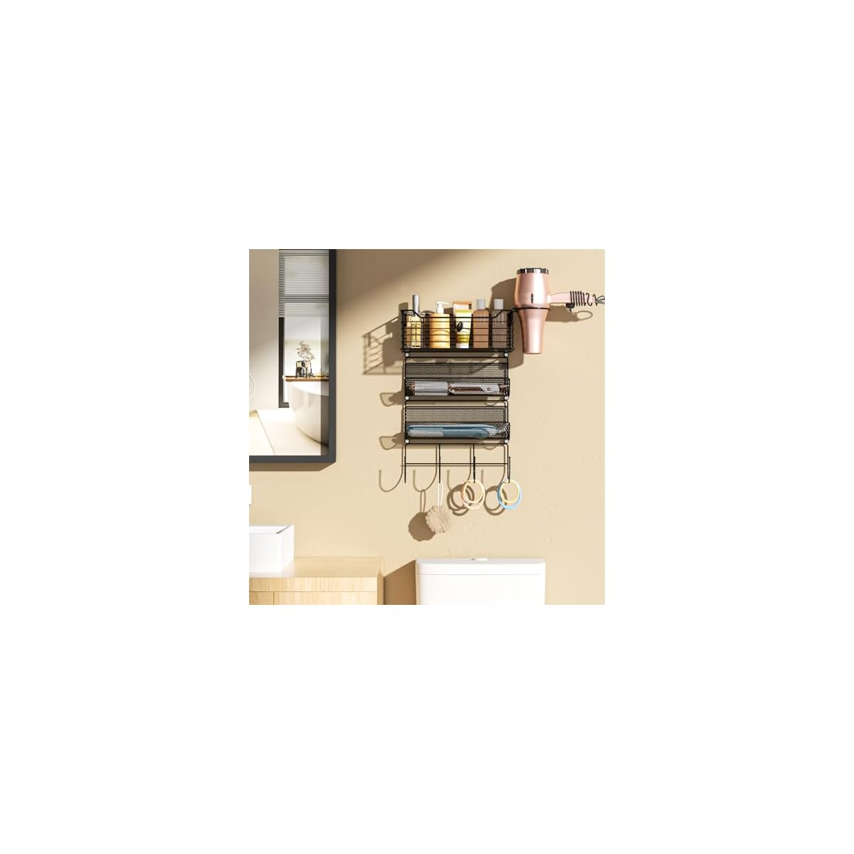 【1 Basket/3 tier Shelf】The hair tool organizer includes 1 metal basket, 2 mesh holders, 1 hairdryer holder, and 1-row hook. Separate all your hair tools, such as curling iron, blow dryer, straightener, etc.