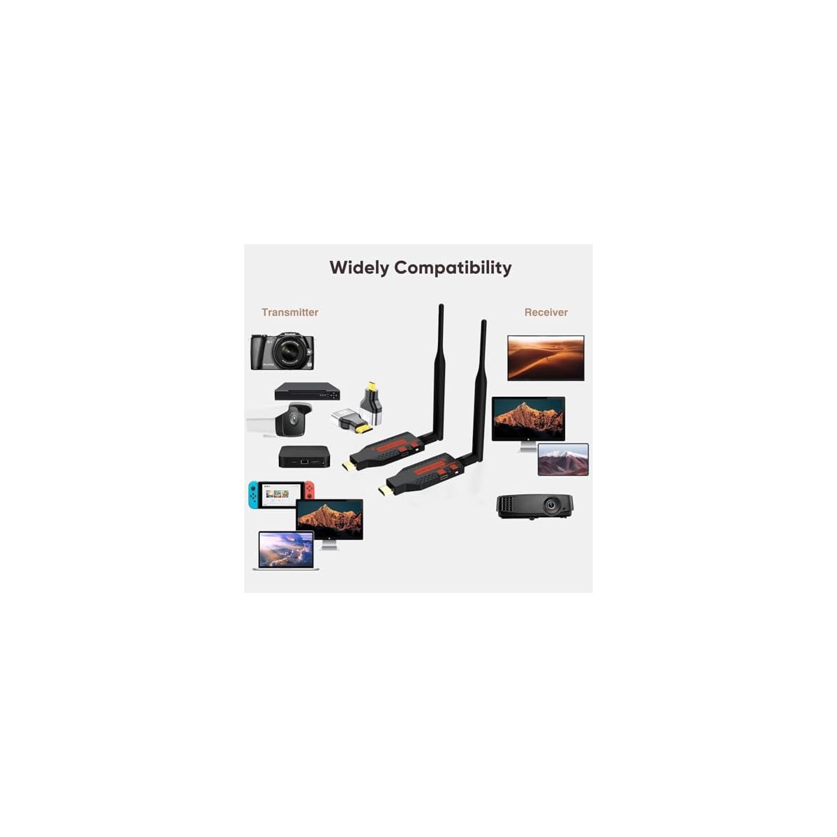 [Dual-Antenna Design, Long-Range, No-Lag, and Strong Compatibility] This wireless HDMI transmitter and receiver with dual-antenna design offers a transmission distance of up to 165 feet/50 meters. It features a built-in high-performance chip for enhanced compatibility, utilizing both 2.4G and 5G dual-band transmission protocols. This ensures strong anti-interference capability and high signal stability, getting rid of issues like flickering, black screens, and delays. (Note: Transmission distance could also be shortened when facing obstacles like walls, floors, and ceilings. Closed spaces between floors would possibly not allow signal transmission.)