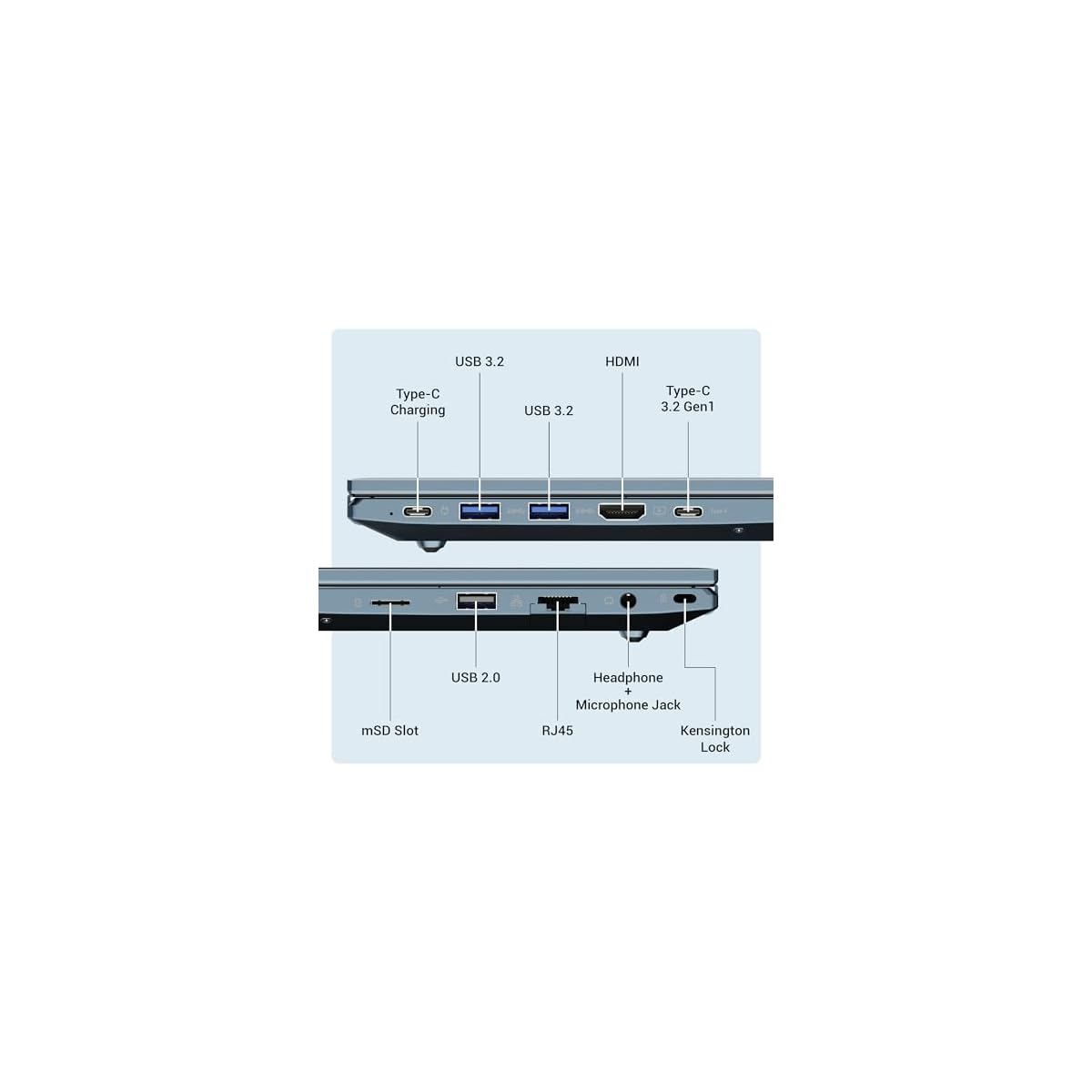 Your seamless connectivity to the laptop comes with 2x USB 3.2, 1x USB 2.0, an mSD slot, a 3.5mm headphone + mic port, 2x Type-C ports (one for charging & other Type C version 3.2 Gen 1 for super fast data transfer) and a HDMI port for video output. The Type C port is capable of providing Display output