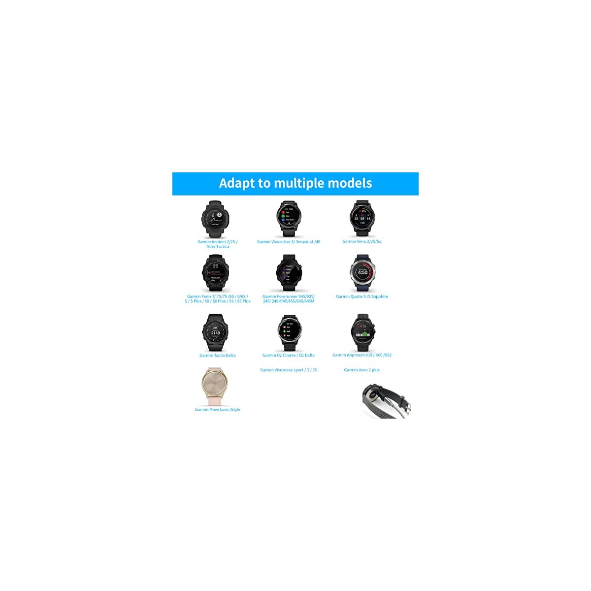 WIDE COMPATIBILITY: Compatible with Garmin fenix 7/ 7S/7X /6S / 6/6X / 5 / 5 Plus / 5X / 5X Plus / 5S / 5S Plus, forerunner 945 / 935 / 245 / 245M/ 45 /45S /645 /645M, forerunner 745/158/55/945 LTE, Garmin Instinct 2/ 2S /Tide/ Tactical, vivomove, EPIX, Tactix Delta, Swim, vivoactive, Quatix, Approach, D2. Please check the specific model at the page before purchase.